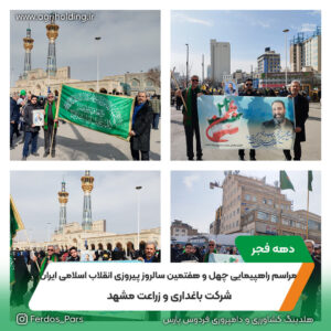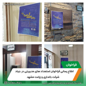 شرکت باغداری و زراعت مشهد در تاریخ ۱۳۷۲/۱۲/۵به صورت شرکت سهامی خاص تاسیس و طی شماره۸۴۹۸ در اداره ثبت اسناد و املاک مشهد به ثبت رسیده است در حال حاضر شرکت باغداری و زراعت مشهد جزءواحدهای تجاری فرعی شرکت گسترش کشاورزی و دامپروری فردوس پارس (هلدینگ کشاورزی بنیاد)می باشد. مرکز اصلی شرکت در شهرستان مشهد وباغات و مزارع آن در شهرستانهای قوچان ،چناران و فریمان واقع شده است.