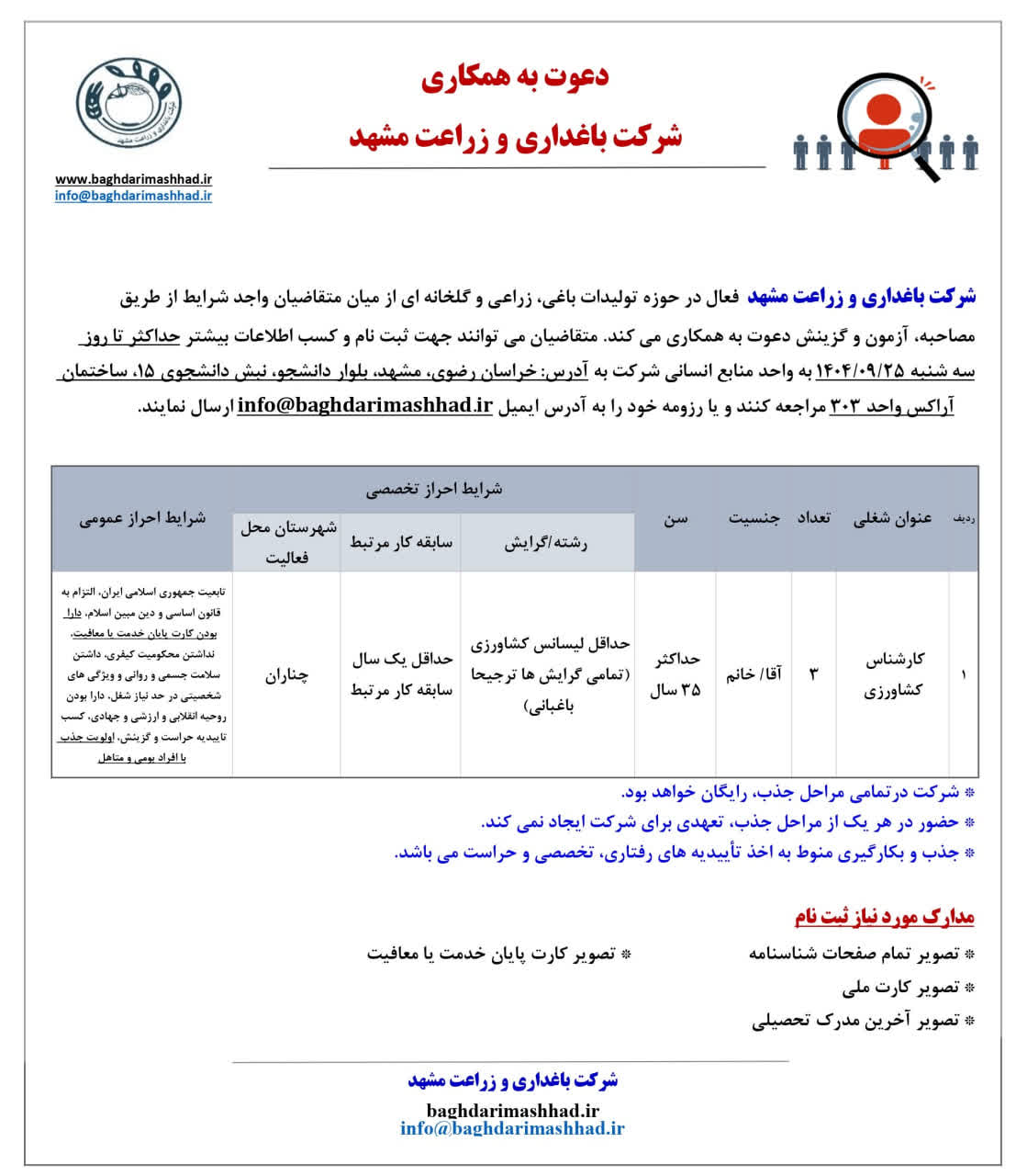 شرکت باغداری و زراعت مشهد فعال در حوزه تولیدات باغی، زراعی و گلخانه ای از میان متقاضیان واجد شرایط از طریق مصاحبه، آزمون و گزینش دعوت به همکاری می کند. متقاضیان می توانند جهت ثبت نام و کسب اطلاعات بیشتر حداکثر تا روز سه شنبه ۱۴۰۴/۰۹/۲۵ به واحد منابع انسانی شرکت به آدرس: خراسان رضوی، مشهد، بلوار دانشجو، نبش دانشجوی ۱۵، ساختمان آراکس واحد ۳۰۳ مراجعه کنند و یا رزومه خود را به آدرس ایمیل info@baghdarimashhad.ir ارسال نمایند.