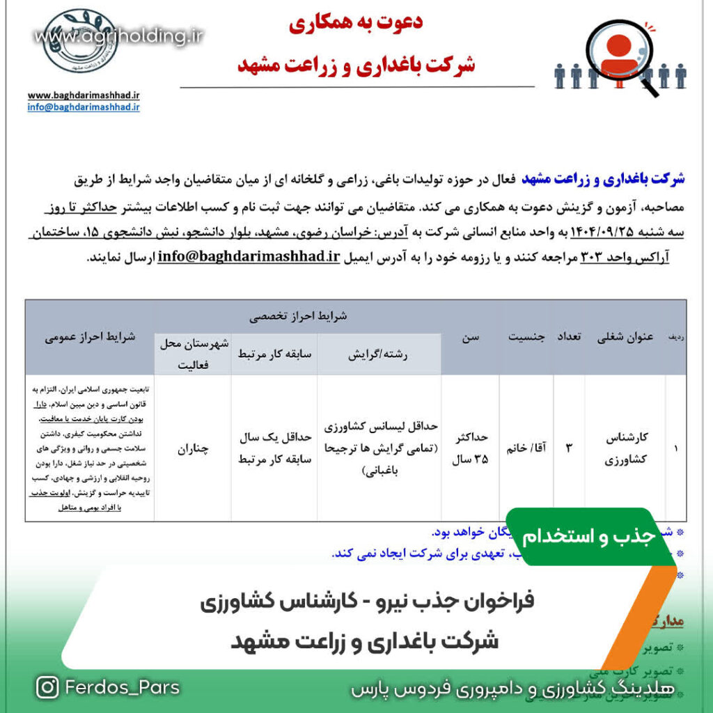 شرکت باغداری و زراعت مشهد فعال در حوزه تولیدات باغی، زراعی و گلخانه ای از میان متقاضیان واجد شرایط از طریق مصاحبه، آزمون و گزینش دعوت به همکاری می کند. متقاضیان می توانند جهت ثبت نام و کسب اطلاعات بیشتر حداکثر تا روز سه شنبه ۱۴۰۴/۰۹/۲۵ به واحد منابع انسانی شرکت به آدرس: خراسان رضوی، مشهد، بلوار دانشجو، نبش دانشجوی ۱۵، ساختمان آراکس واحد ۳۰۳ مراجعه کنند و یا رزومه خود را به آدرس ایمیل info@baghdarimashhad.ir ارسال نمایند.