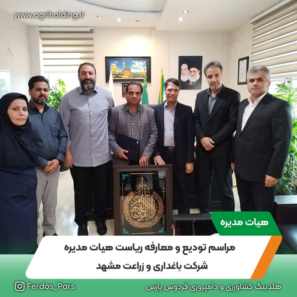 به گزارش روابط عمومی شرکت باغداری و زراعت مشهد، مراسم تودیع و معارفه ریاست هیاتمدیره شرکت با حضور جناب آقای ربیعی معاونت محترم مالی، اداری و امور مجامع، جناب آقای مهندس درویش مدیر محترم تولید کشاورزی هلدینگ، جناب آقای مهندس یاحقی مدیرعامل شرکت به همراه اعضای هیأتمدیره و مدیران ارشد شرکت در محل دفتر مرکزی شرکت برگزار گردید.